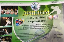 Команда гимназии № 2 имени Баки Урманче получила диплом III степени за участие в соревнованиях по бильярду среди Совета отцов образовательных учреждений. Желаем дальнейших спортивных успехов!