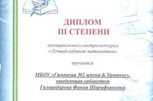 В городском конкурсе кабинетов математики кабинет учительницы математики Галиякбаровой Фании Шарифьяновны занял III место. Поздравляем с победой и желаем дальнейших успехов.
