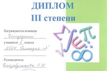Поздравляем учеников 5м класса Билалова Салавата, Садыкову Аделину, Ахмезянову Ляйсан, Габдрахманова Ильмира и учителя математики Кинзябулатову Энзе Ильдусовну с Дипломом III степени в IV математической игре среди 34 команд города Нижнекамска. Желаем дальнейших успехов в изучении математики.
