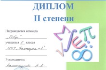 Поздравляем учеников 5а класса Камалтдинова Айдара, Суфиянова Алмаза и учеников 5в класса Фарраева Айзата, Шаяхметова Булата и учителя математики Ахматнурову Айсылу Альбертовну с Дипломом II степени в IV математической игре среди 34 команд г. Нижнекамска. Желаем дальнейших успехов в изучении математики