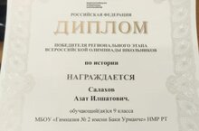 2024 нче елның 25 нче гыйнварында тарих буенча Бөтенроссия олимпиадасының төбәк этабында җиңүчеләрне һәм призерларны бүләкләү тантанасы булды. Безнең гимназиянең 9 нчы Б сыйныф укучысы Салахов Азат (укытучысы Шакирова Э.К.) җиңү яулады. Молодцы.Котлыйбыз. Яңадан-яңа уңышлар телибез.