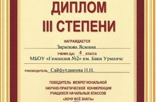 Поздравляем Зарипову Ясмину с призовым местом в межрегиональной научно-практической конференции учащихся начальных классов "Хочу всё знать". Руководитель: Сайфутдинова Н.Н. Желаем дальнейших успехов и побед!