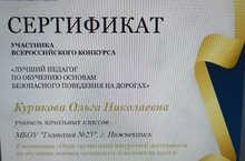Учитель начальных классов, руководитель отряда ЮИД "Светофор" Курикова Ольга Николаевна участвовала во Всероссийском конкурсе "Лучший педагог по обучению основам безопасного поведения на дорогах" и получила сертификат участника. Мы гордимся вами!