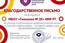 Нижнекамский Волентерский центр награждает Волонтёрский штаб и совет старшеклассников гимназии "Содружество" Благодарственным письмом за помощь в организации добровольческой акции "Осенняя неделя добра- эстафета добрых дел #ДОБРЫЙНИЖНЕКАМСК". Мы поздравляем и гордимся вами! Спасибо за работу!