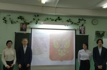 Каждую субботу утро в гимназии начинается с классного часа. Сегодня учащиеся 9Г класса и классный руководитель Мещерских Е.Г. провели классный час на тему " Символы Российского государства". Цели мероприятия - воспитание уважения к историческому прошлому России, ее символике как отражению независимости, суверенитета и статуса государства, а также формирование основ политической и правовой культуры учащихся.