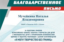 Социальный педагог Мучейкина Н.В. подготовила двух участников из числа детей-инвалидов гимназии во Всероссийском конкурсе "Я могу! Творчество без границ" среди детей с ограниченными возможностями здоровья. Ребята приняли участие в творческом конкурсе, проявив свои таланты в рисовании и владении словом. Один ребенок стал призером, второй получил диплом участника.