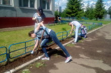 Воспитанники ЛТО "Мечта" облагораживают территорию гимназии. Ребята производят прополку клумб от сорняков, рыхлят почву под деревьями в пришкольном огороде.