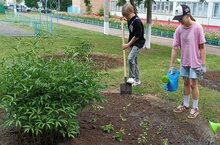 Чтобы радовался глаз и было приятно приходить на территорию родной гимназии, ежедневно здесь работают дети трудовой бригады под руководством учителя биологии Давлетшиной В.В.
