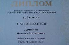 Поздравляем призера регионального этапа Всероссийской олимпиады школьников по биологии ДЕМИДОВУ НАТАЛЬЮ, ученицу 9 А класса.