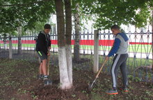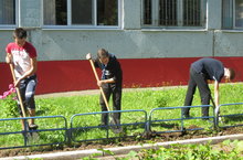 Учащиеся из трудового объединения школьников "Мечта" занимаются уборкой и озеленением прилежащей территории. Мальчики очищают бордюры от травы, девочки пропалывают клумбы, ухаживают за цветами в зимнем саду. Все дружно готовятся к новому учебному году.