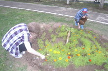 Весь участок школьного двора – один сплошной газон разнотравий, который служит прекрасным фоном для цветочных клумб, деревьев и декоративных кустарников. Не случайно, школьники заняты благоустройством территории. -
