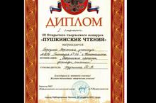 25 апреля 2012 года в Лицее № 78 г.Набережные челны прошел III открытый Республиканский творческий конкурс «Пушкинские чтения», в котором впервые приняла участие команда нашей гимназии в составе 13 человек. Наши учащиеся получили дипломы 1, 2 и 3 степеней в различных секциях.