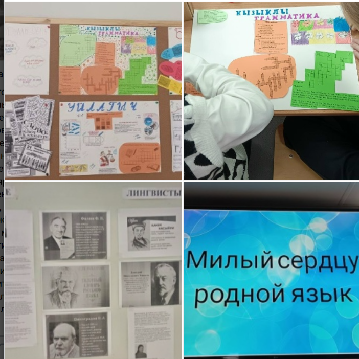 Обучающие совместно с учителями родных языков оформили рекреации школы цитатами о родном языке, ребусами, кроссвордами, занимательными задачами по русскому и татарскому языкам, стендами "Великие лингвисты". На переменах звучала песня "И Туган тел" на разных языках. -