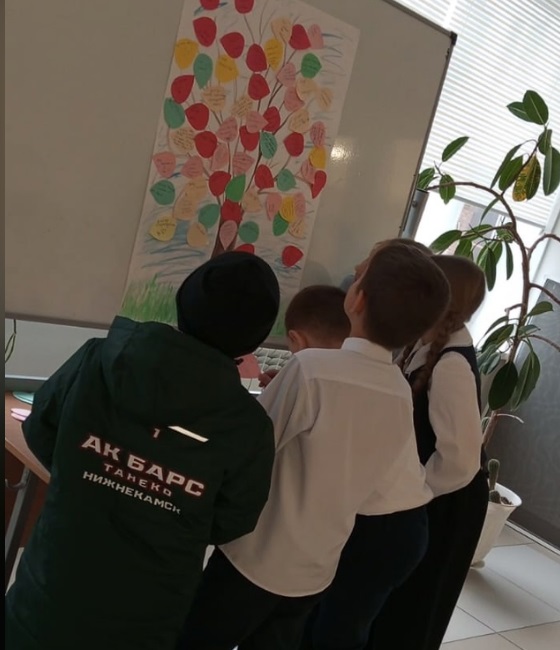 В рамках осенний недели психологии в школе организовали "Дерево пожеланий", в течении дня на ствол нарисованного дерева ученики и учителя приклеивают на дерево листочки с пожеланиями школе, ученикам, учителям. -