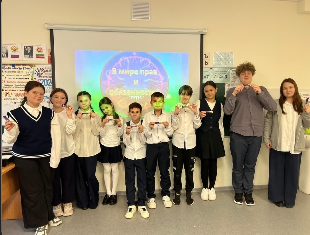 Среди участников отряда профилактики правонарушений «Ястребы» прошла увлекательная викторина «В мире прав и обязанностей». Ребята активно отвечали на вопросы, узнали много нового и интересного. Все участники получили сладкие призы -