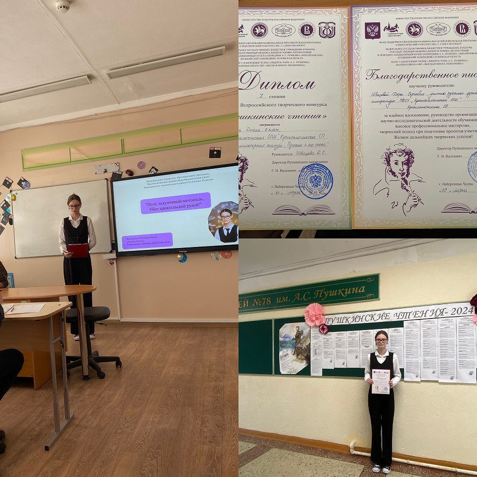 Обучающаяся 9 класса,Мазилина Д., заняла 2 место во Всероссийском Открытом творческом конкурсе «Пушкинские чтения», который проходил на базе МАОУ «Лицей 78 им. А.С.Пушкина» г.Набережные Челны.