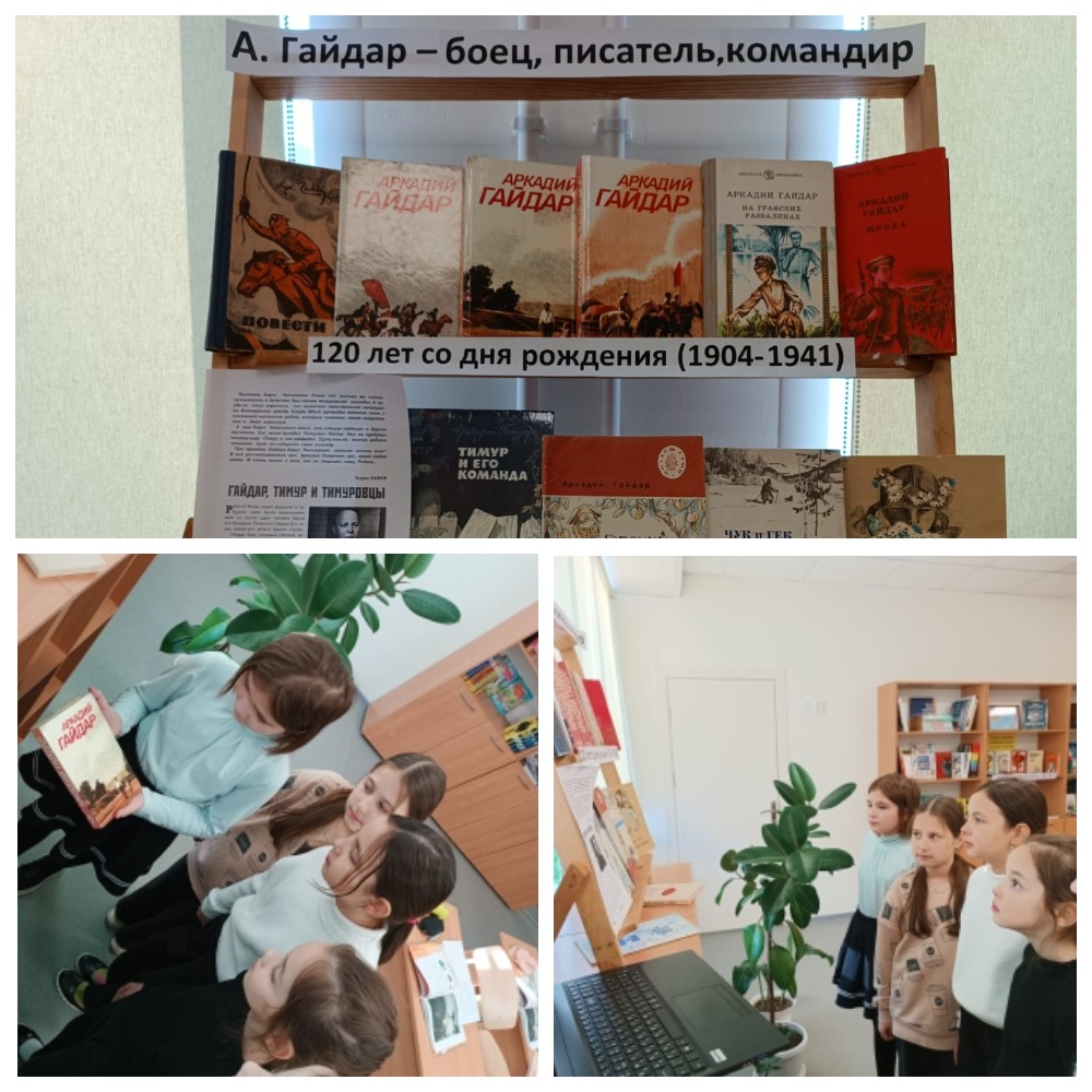 К юбилею писателя в школьной библиотеке участниками кружка "Юный библиотекарь" оформлена выставка книг "А. Гайдар - боец, писатель, командир". Для учащихся 3-х классов организована выставка-беседа, где ребята смогли ознакомиться с биографией и творчеством А. Гайдара. -