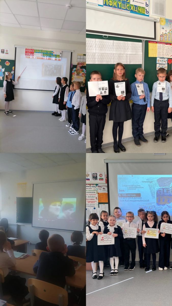 2023 года в начальной школе прошел классный час «Разговоры о важном», посвященный 100-летию со дня рождения Зои Космодемьянской.Обучающиеся узнали, что 18-летняя девушка добровольно ушла на фронт. Она и ее товарищи получили задание отправиться в тыл, чтобы «взрывать вражескую технику, обрывать связь и уничтожать склады с оружием». В ноябре 1941-го разведчицу схватили фашисты. Но, несмотря на пытки, Зоя ничего не выдала гитлеровцам, и ее казнили.
