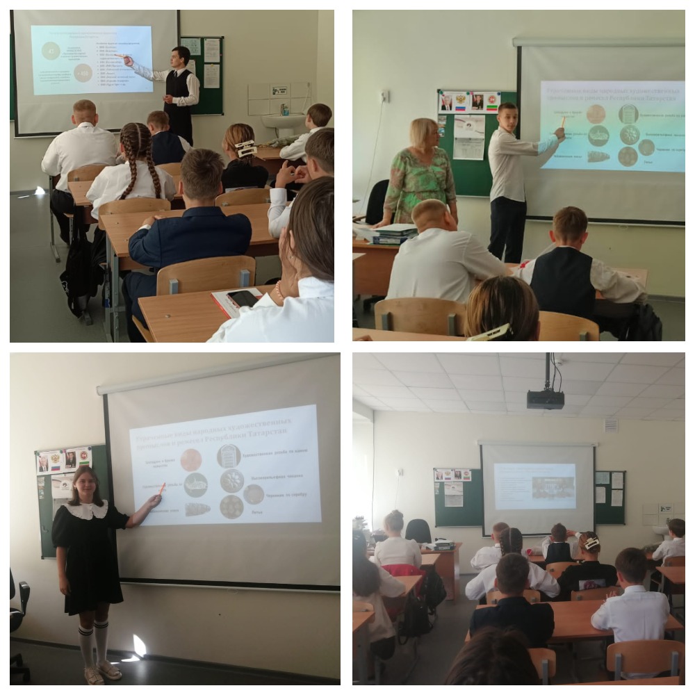 В день знаний во всех классах прошел классный час на тему "Народные художественные промыслы РТ" С целью формирования у обучающихся представления о важности сохранения и развития духовных ценностей, возрождения исконных национальных традиций, развитие национальных ценностей, обычаев культуры и традиций народов Республики Татарстан. -