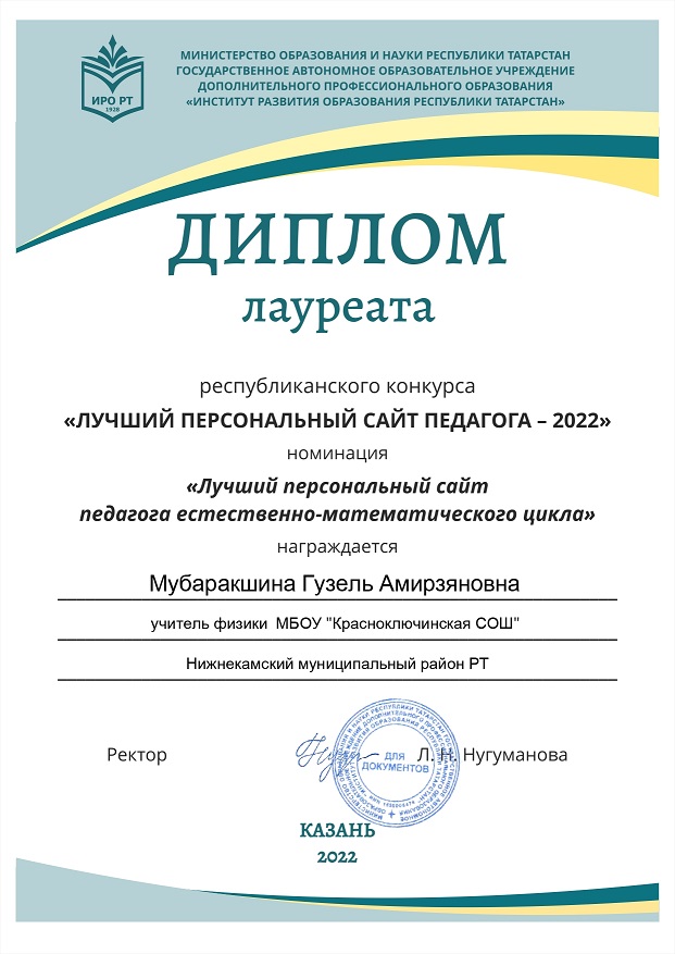 ОУ ДПО «Институт развития образования Республики Татарстан» проводил Республиканский конкурс «Лучший персональный сайт педагога – 2022 ». Основная цель Конкурса – поддержка и развитие практического использования сетевого образовательного интернет-пространства и эффективного использования информационно-коммуникационных технологий в образовательном и воспитательном процессе. В этом конкурсе учитель физики и информатики Мубаракшина Гузель Амирзяновна стала лауреатом в номинации «Лучший персональный сайт педагога естественно- математического цикла». Поздравляем!