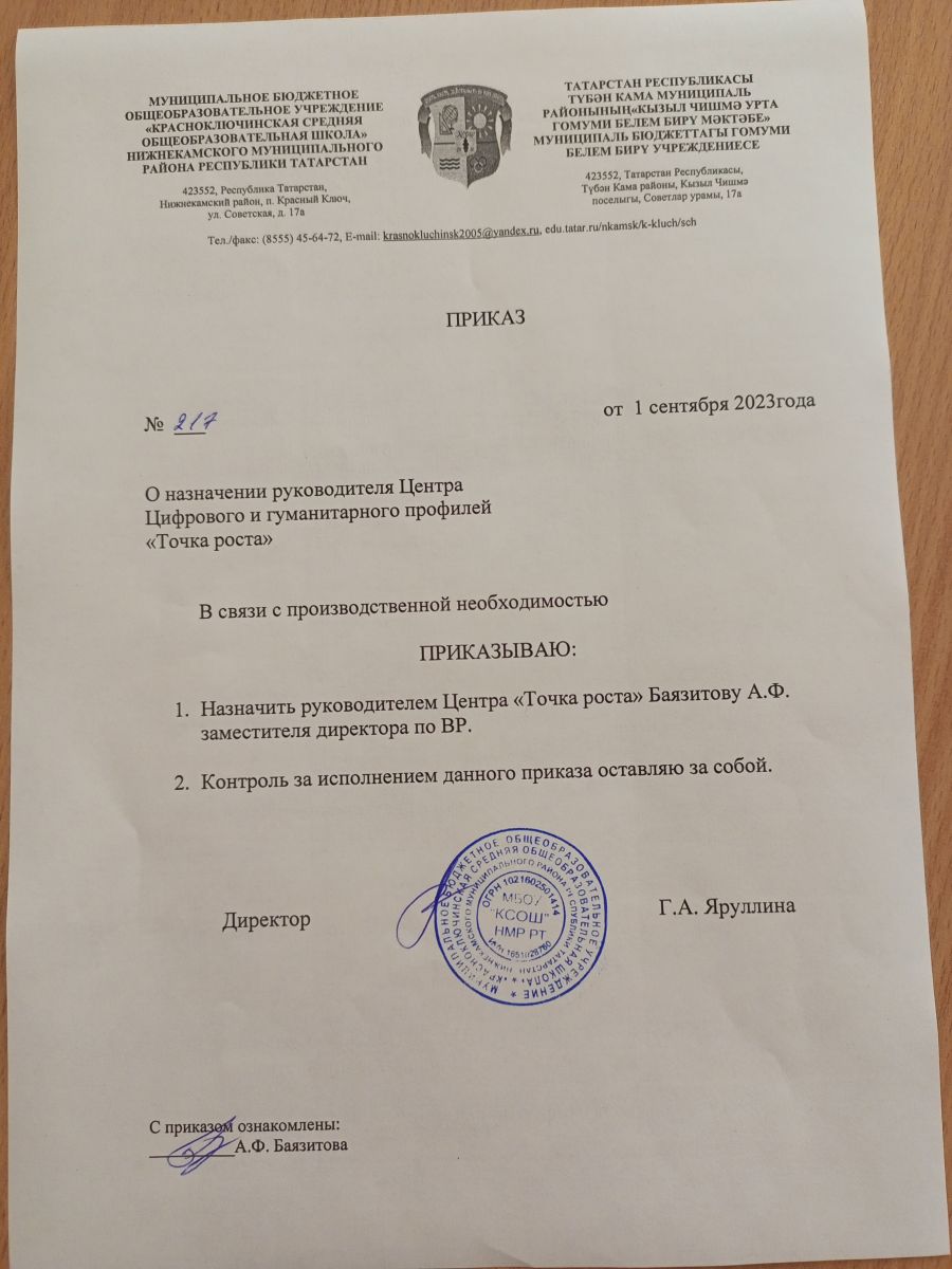Приказ о назначении руководителя Центра "Точка роста" 2023