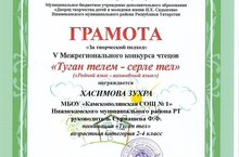 В номинации авторских произведений «Пиши, перо моё, пиши…» стали победителями обучающиеся нашей школы: Ильязарова Диана награждена Дипломом I степени (рук. Сибгатуллина Ф.А.), Гараев Аяз награжден Дипломом II степени (рук. Гараева Г.Ш.). Конкурс организован Управлением образования Исполнительного комитета НМР РТ, ЧОУ ВО «Казанский инновационный университет имени В.Г. Тимирясова (ИЭУП)», Нижнекамский филиал,