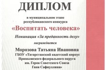 Педагог - организатор ТКК ПФО Морозова Татьяна Ивановна награждена Дипломом за победу в номинации "За преданность делу" на муниципальном этапе республиканского конкурса "Воспитать человека". Торжественная церемония награждения состоялась 11 октября 2021 года в молодежном центре инициатив " Ковер". Поздравляем Вас, Татьяна Ивановна, с победой! И желаем творческих побед и новых достижений!