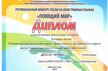 Хотим поделиться радостной новостью: наш воспитанник Антон Козырев получил диплом регионального конкурса песен на иностранных языках «Поющий мир»! Конкурс проходил в Набережных Челнах. Антон на английском языке спел песню «Closer» («Поближе»). Поздравляем от души! Желаем хорошей учебы и дальнейших побед! Выражаем слова благодарности педагогу – учителю английского языка Айгуль Райхатовне Ситдиковой за достойную подготовку кадета!
