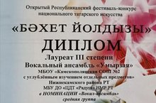 Поздравляем вокальный ансамбль "Умырзая" и его руководителя Габдулхакову И.Г. с отличным результатом в Открытом Республиканском фестивале-конкурсе "Бэхет йолдызы". Желаем дальнейших успехов!