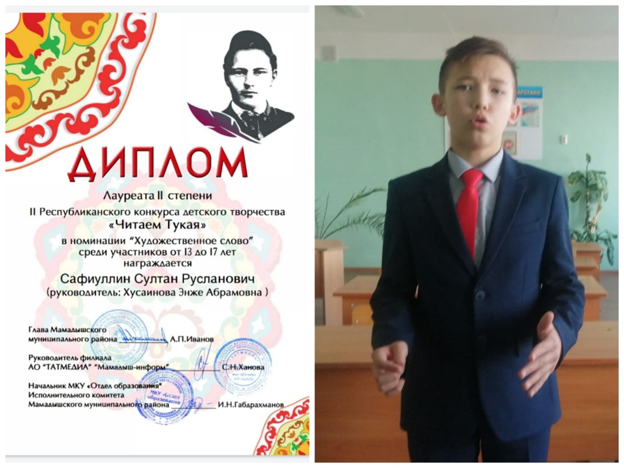 Лауретом IIстепени в Республиканском конкурсе детского творчества стал ученик 7Б класса Сафиуллин Султан (руководитель Хусаинова Э. А.)