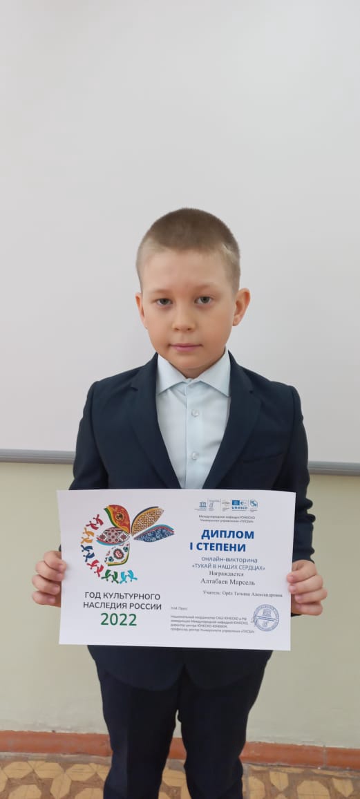 Поздравляем Алтабаева Марселя 2А класс с победой в онлайн викторине "Тукай в наших сердцах".Молодец!!!