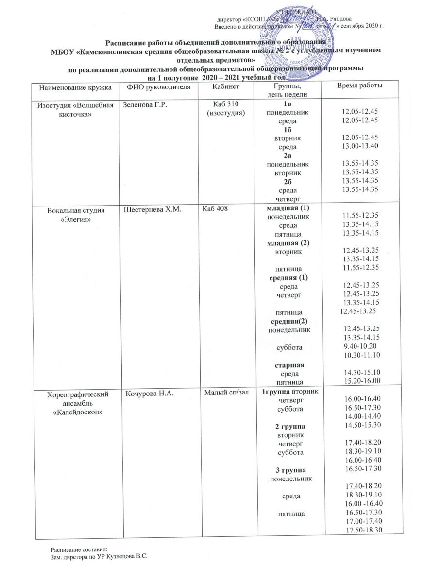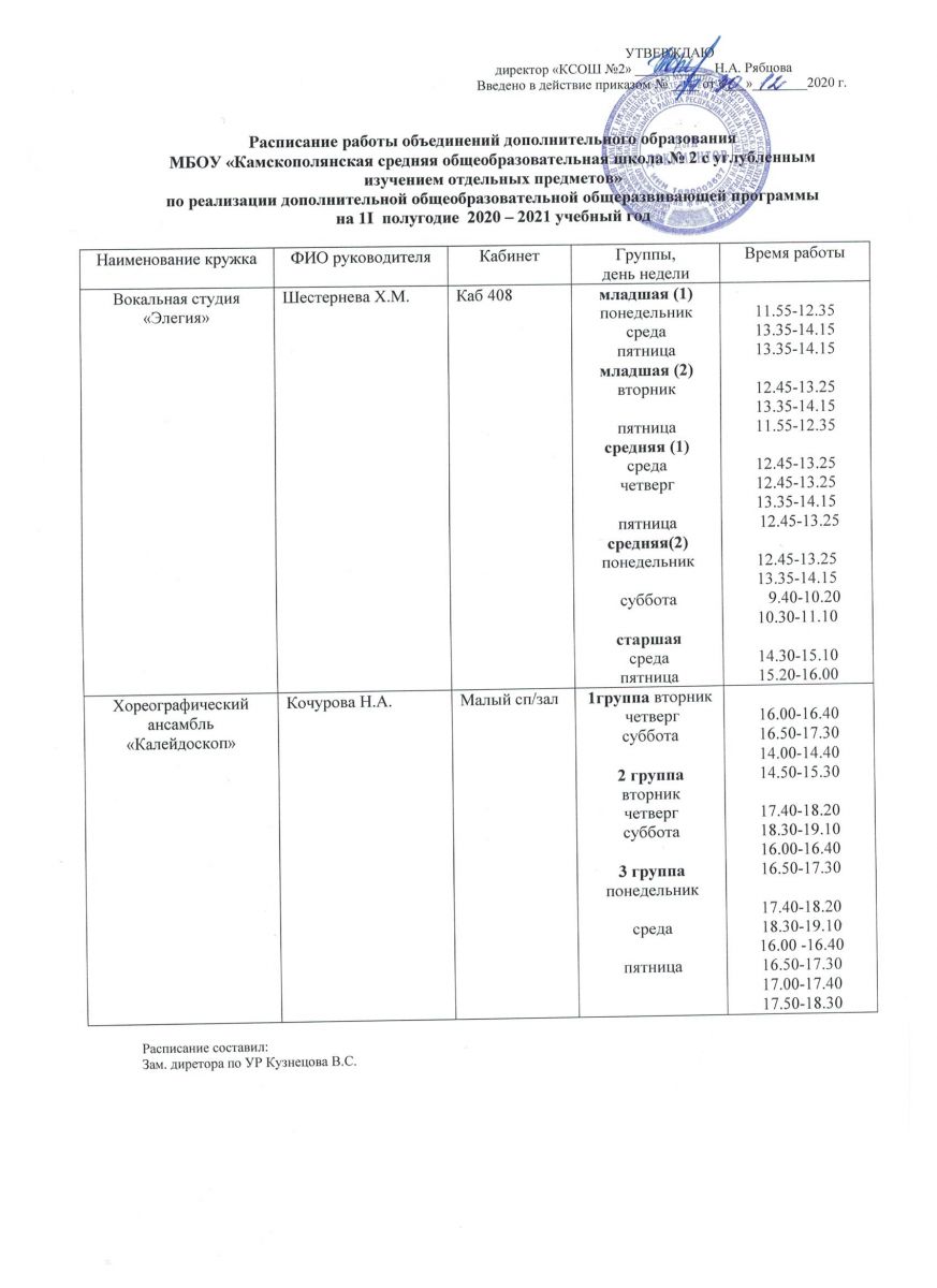 Расписание работы объединений дополнительного образования на II полугодие 2020-2021 учебного года