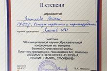 19 апреля на базе КИУ им. В.Г. Тимирясова Нижнекамский филиал была проведена VII муниципальная научно-образовательная конференция имени ветерана Великой Отечественной войны, почетного гражданина г. Нижнекамска М.Г. Казакова «Великая Отечественная война: знание, память, служение». Ямалеева Лейсан гр.119 награждена дипломом 2 степени (преподаватель Ямалеев И.Ф), Рожин Владислав гр.3811 награжден дипломом 3 степени (преподаватель Пупышев И.В.).