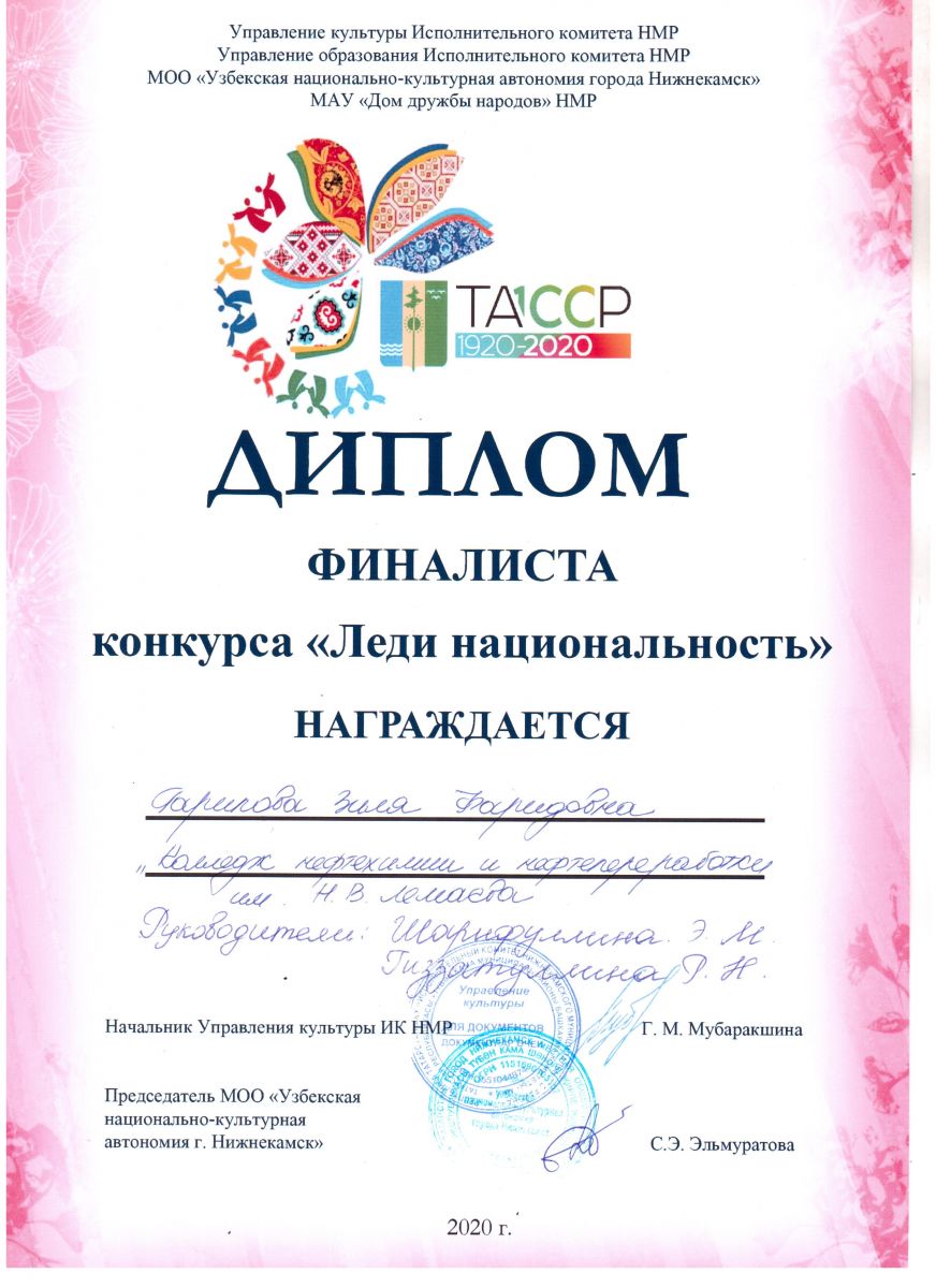 Опубликовано: 18.11.20209 октября на базе МАУ «Дом дружбы народов» прошел конкурс «Леди национальность». Студентка колледжа Гарипова Зиля группа 1011 (руководители Шарифуллина Э.М., Гиззатуллина Р.Н.) приняла участие в конкурсе. Зиля выступила с творческим номером, награждена дипломом финалиста. Поздравляем!