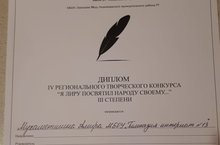 Ученица 7а класса Нургатина Камилла приняла участие в Международном конкурсе по русскому языку и культуре речи. Она удостоена диплома 3 степени. Поздравляем Камиллу и желаем ей дальнейших успехов в интеллектуальных конкурсах.