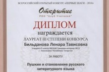 Всероссийский открытый конкурс "Первые шаги" (г. Москва). Поздравляем учениц 9 А класса с победой в конкурсе научно-исследовательских работ в номинациях "Русский язык", "Культура родного края" :Шайдуллину Раилю, Пивоварову Алину, Бильданову Ленару и учителя русского языка и литературы Жданко С.Д.