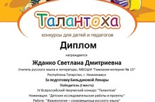Закончился IV всероссийский конкурс творческих работ для школьников "Талантоха". В нём приняли участие учащиеся 9 и 10 классов, отправив работы по номинациям "Детские исследовательские работы и проекты", "Кроссворд" (учитель Жданко С.Д.). Поздравляем Бильданову Ленару, занявшую 1 место, Мазитову Алину, Ягмырову Айгуль, Шайдуллину Раилю, удостоенных дипломов лауреата. Желаем дальнейших творческих успехов.