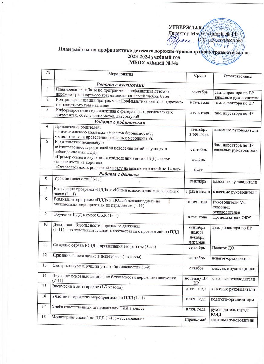 План работы отряда ЮИД МБОУ "Лицей №14" НМР РТ на 2023 - 2024 учебный год