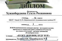 Хужанбердиева Гузель приняла участие в Xl Республиканском конкурсе научно-практических, проектных и творческих работ учащихся на основе естественно-научных дисциплин "Я выбираю село" и получила Диплом I степени. Руководители : Хужанбердиева Ч. Т., Галиева Г. И.. Поздравляем!