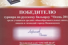 Турнир по русскому бильярду 05.11.2016 3 ноября состоялся турнир по русскому бильярду "Осень-2016" среди учащихся общеобразовательных школ. В турнире принимали участие Евремов Н.-11в и Ларионов Роман-7а. Среди всех участников турнира победителем стал Ларионов Роман. Поздравляем!