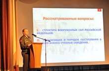 Есть такая профессия... 08.11.2016 8 ноября Нижнекамске прошла Всероссийская информационно-агитационная акция «Есть такая профессия - Родину защищать!» На мероприятие во Дворце творчества детей и молодежи им. И. Садыкова присутствовали учащиеся 11-х классов лицея. Вначале перед ребятами выступил военком РТ Сергей Погодин, который на своем примере рассказал о военной службе. Военком также рассказал ребятам о видах и родах войск, о службе в Вооруженных силах, оснащении современной техникой и вооружением, военной экипировкой и различными спасательными средствами. Помимо этого молодым ребятам продемонстрировали фильм о высших военных учебных заведениях страны.