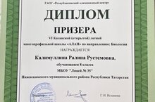 VI Казанская (всероссийская) летняя многопредметная школа “Алан” и в этом году организовала профильные смены для обучающихся общеобразовательных организаций Республики Татарстан, успешно прошедших муниципальный и региональные этапы всероссийских олимпиад школьников по биологии, физике и химии на базе оздоровительного комплекса "Дуслык". На смену приглашались обучающиеся 8 и 9-х классов. Из нашего лицея обучение прошла ученица 8а класса Калимуллина Ралина, которая в течении трех лет успешно выступала и получала призовые места на муниципальных этапах олимпиады по биологии. Ребята не только познавали секреты природы, но и принимали активное участие в творческих конкурсах, посещали музеи и активно отдыхали. Самое главное: они познакомились и общались с единомышленниками. В конце смены ребята сдавали зачёт и наша ученица стала призером на этом испытании. Это было нелегко: из 39 участников смены только 8 смогли достойно пройти это испытание. Надеемся, что полученный опыт поможет Ралине достичь успехов на региональном этапе олимпиад.