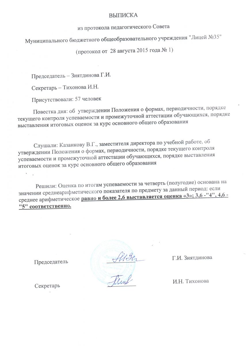 Выписка из протокола педагогического совета о критериях выставления оценок за учебный период