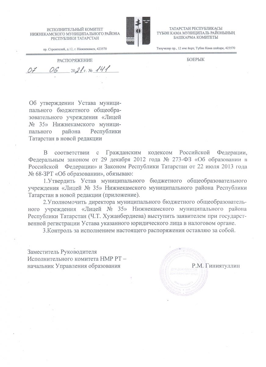 Распоряжение ИК № 141 от 07_06_2021г об утверждении Устава лицея 35