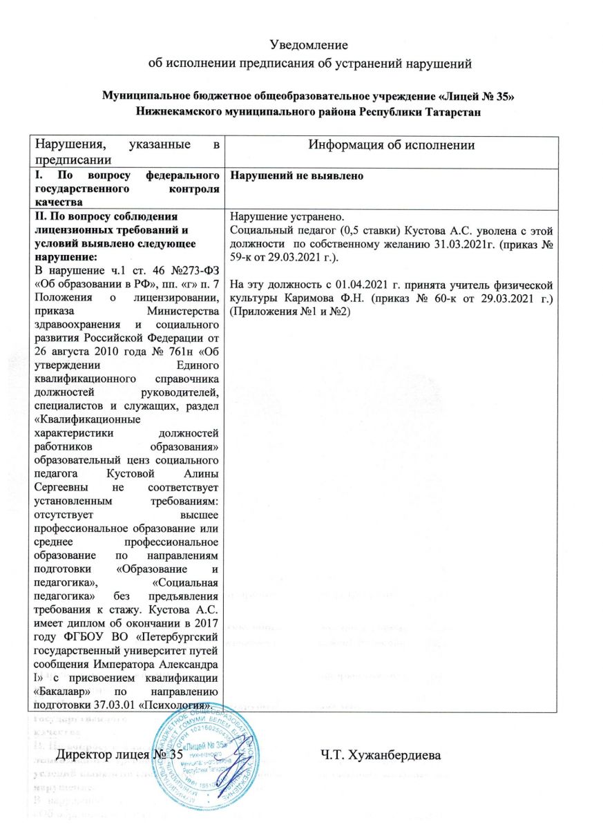 Уведомление о снятии с контроля Лицей № 35 Нижнекамск август 2021