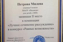 Ежегодно весной Министерство образования и науки Республики Татарстан проводит творческий конкурс "Равные возможности" среди обучающихся с ограниченными возможностями здоровья. В этом году в конкурсе приняли участие трое учащихся нашей школы. Ученица 8 класса Петрова Милена стала победительницей конкурса в номинации "Лучшее сочинение-рассуждение". Остальные учащиеся получили сертификаты участников конкурса.