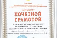 17 марта 2015 года на XVI отчетно-выборной конференции территориальной организации профсоюза работников государственных учреждений и общественного обслуживания нашему учреждению за активную работу по защите прав и законных интересов членов Профсоюза и в связи с 50-летием со дня ее образования была вручена Почетная грамота Татарстанской Республиканской организации профсоюза работников государственных учреждений и общественного обслуживания.