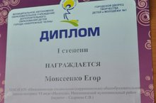 Ученик 9А класса Моисеенко Егор, приняв участие в выставке-конкурсе "Делу-время, потехе-час" в рамках XII Республиканского фестиваля искусств, ремесел и декоративно-прикладного творчества" "Алтын куллар", занял 1 призовое место в номинации: вышивка «Традиционные народные орнаменты», руководитель Садриева С.В.