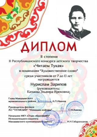 Учащийся 1 подготовительного класса Зарипов Нурислам под руководством учителя начальных классов Капаевой Э.И. принял участие во II республиканском конкурсе детского творчества "Читаем Тукая" и был награжден дипломом II степени! Поздравляем!