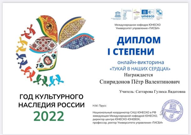 Учащийся 4 А класса Спиридонов Пётр принял участие в республиканской онлайн-викторине «Тукай в наших сердцах» и был награждён дипломом I степени